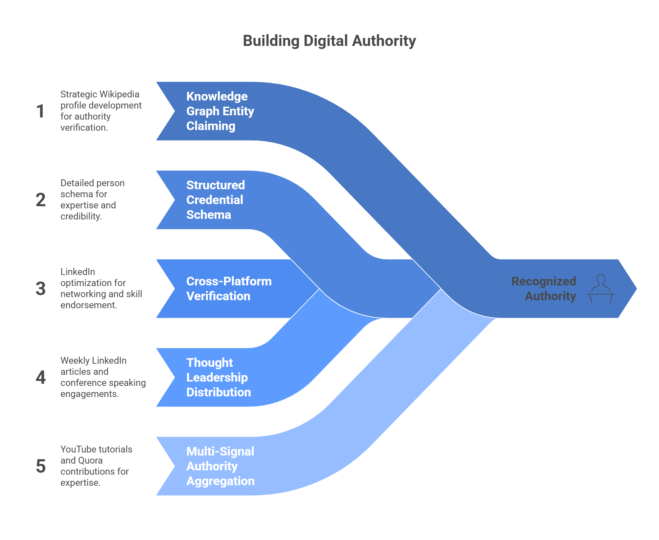 Knowledge Graph Entity Claiming: Establish and verify Knowledge Graph entities for key company personnel and the organization itself through strategic Wikipedia profile creation (following notability guidelines with multiple independent secondary sources), Google Search Console entity claiming, and consistent NAP+E (Name, Authority markers, Profile links, Expertise tags) across all digital touchpoints. Knowledge Graph presence serves as a primary authority signal that AI systems query when validating source credibility.