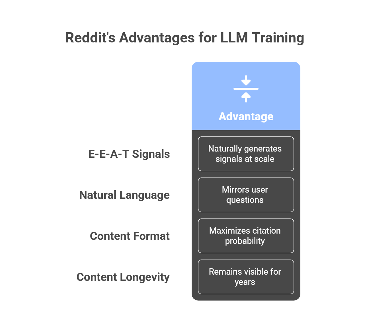 Google's E-E-A-T framework (Experience, Expertise, Authoritativeness, Trustworthiness) was designed for human content evaluation. Reddit's community architecture naturally generates these signals at scale: